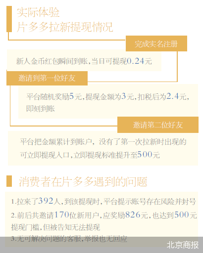 用户:提现时发现被封号 消费者夏女士在一个月前通过朋友介绍,得知在片多多看视频、拉新能赚钱,便下载了片多多。“平台上介绍说邀请1-3人,每人奖励5元;邀请4-7人,每人奖励10元;邀请8-10人,每人奖励15元。最后,我前前后后总计拉来了392人,按照他们的这个算法,我的提款金额应该能到1620元。”夏女士如是说。 然而,到该提现的时候,夏女士却慌了神:“平台提示我的账号存在风险,直接给我封了号,到头来我这是竹篮打水一场空。” 与夏女士有类似经历的还有消费者张先生。据张先生透露,在片多多上自己前后共邀请了170位新用户,“明明应奖励826元,也同时达到了500元提现门槛,但却被告知无法提现”。 为了进一步印证消费者反映的情况,北京商报记者下载了片多多进行实测。当完成实名注册并登录后,新人金币红包瞬间到账,当日可以提现0.24元。当成功“拉新”,邀请到第一位好友时,平台随机奖励了5元,此时立即提现的金额为3元,扣税后得到2.4元,且即刻到账。但当北京商报记者邀请第二位好友时,平台却只是把金额累计到了账户,没有了第一次拉新时出现的可立即提现的入口,与此同时,立即提现的标准也提升至了500元。 据夏女士进一步介绍,“最初,像6元、4元、2元这种小金额奖励确实可以顺利提现,但是一到几十元、上百元这种大额提现,就屡屡受挫。而且,刚开始拉新时,平台是提示25元可以提现,攒够25元,又变成45元可以提现,攒够45元,又变成85元可以提现”。 这一设置也引起更多消费者的不满,据黑猫投诉平台显示,截至北京商报记者发稿,关于片多多“虚假宣传”“邀请奖励不到账”“无客服 反馈不处理”等投诉信息已多达26条。