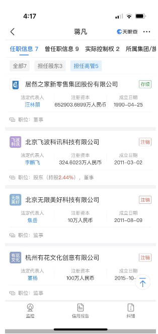 图片来源:天眼查App截图 天眼查显示,蒋凡当前已无法定代表人职务,关联企业共7家,其中3家已注销,在居然之家担任董事,间接持股企业数量达118家。 早在去年年底,阿里的内部信中提到,戴珊将分管大淘宝业务,包括淘宝、天猫和阿里妈妈,蒋凡负责全球速卖通等国际业务。