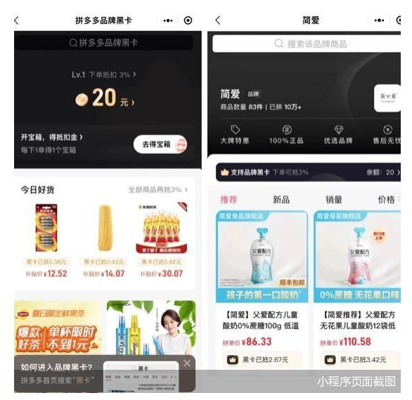 不仅如此,较之用户需主动在拼多多App主站搜索黑卡优惠,“拼多多福利券”反而将“品牌黑卡”频道入口放置在页面的醒目位置。根据网上公开资料,北京商报记者了解到,拼多多的“品牌黑卡”功能早在2020年5月已经处于内测阶段,需要好友邀请才能获得黑卡,而黑卡金额有效期为2小时。然而,记者发现,无论是拼多多App主站还是小程序上,当前黑卡已经免除了邀请门槛,而金额使用时间延长至30天。 暗中引流品牌 那么,为何会取消黑卡邀请门槛?对此,拼多多相关负责人未进行回应。一位拼多多工作人员则解释为:平台活动升级优化所致。此外,该工作人员提及,黑卡的价格优惠主要来自平台。 从会员的体系构成来看,北京商报记者了解到,黑卡会员一共分为6个等级,用户每日访问、下单等行为均能提高成长值。随着会员等级提升,黑卡折扣比例和单笔金额上限也会增长。例如最高等级的星耀会员折扣比例能达10%,单笔上限为40元。另外,用户每下一单,还能获得5-30元不等的折扣金。 显而易见,品牌方让利的同时,拼多多也在构建一套能促成品牌流量曝光、转化率上升的用户激励机制。不过,在“拼多多福利券”上,目前参与黑卡折扣的快消类目品牌商较多,而服装、家电等高价商品的知名品牌数量还较为有限。那么,拼多多是否会借“品牌黑卡”体系来打造自己的“天猫”呢?对此,其相关负责人向北京商报记者否认,称没有该计划。 不过,通过吸引品牌入驻、对品牌旗舰店打标、与品牌共创新品等手段,近几年拼多多一直在补齐品牌化短板。数据显示,今年“6·18”期间,截至6月17日24时,拼多多家电品牌官方旗舰店的数量同比增长182%,商品数量同比增长264%。 值得注意的是,除了拼多多,当下抖音、快手也在吸纳和争取更多品牌入驻。数据显示,在“抖音618好物节”期间,服饰鞋包行业GMV破百万的品牌商家达到2467个。而快手“6·16”活动期间的品牌商家GMV同比增长达515%。 寻找细分增量 以保商家来做文章成了今年“6·18”头部电商的共同动作。例如阿里国内数字商业板块总裁戴珊曾在此前的商家座谈会上强调“帮助商家稳大盘、有增长”是今年最重要的事情。而京东则是发布30项“三减三优”扶持举措来纾解商家在供应链上的压力。 事实上,于电商而言,品牌商不仅意味着较为完善成熟的商品质量和履约体系,在资源资金实力、新品开发、营销能力等维度上也要优于其他商家。依靠品牌效应,品牌商既能为平台带来新的用户群,抬升中高端用户消费需求,还构成平台收益的重要组成部分,这也是平台、头部主播争相向品牌商示好的根本。 另一方面,头部电商也不得不应对流量增速整体放缓的现状。从2021年起,拼多多面临着营收与用户活跃增长乏力的双重压力。财报显示,在2021年二季度,拼多多营收为230.46亿元,同比增长89%,平均月活跃用户数达7.39亿,同比增长30%。然而,该两项数据持续下滑至2022年一季度,其营收的同比增速降至7%,而平均月活跃用户数的增速则跌到4%。 “拼多多做黑卡会员是为了提升品牌商家的比重,增加商品品牌数量,满足下沉市场消费升级的趋势。其次,微信的用户日活规模很大,拼多多也在探索主站与微信用户之间的协同。在微信规则范围内,以各种各样定位的小程序和运营手段来满足用户的差异性需求。”零售电商行业专家、百联咨询创始人庄帅向北京商报记者指出。 据了解,“拼多多福利券”之外,例如拼多多的快团团、群买买这类微信小程序主要定位于社区团购、社交分销。在此之前,拼多多还与腾讯、OPPO等企业合作尝试过企业员工内购功能。
