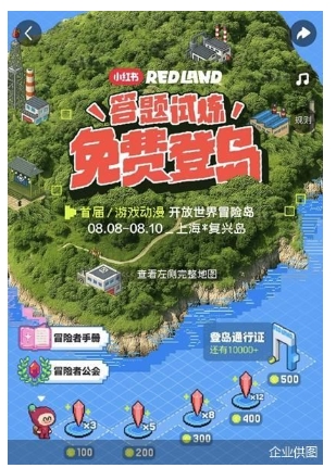 【直报网北京7月17日讯】(北京商报)7月16日,小红书正式官宣,将打造全球首个开放世界冒险岛活动“RED LAND”,并于8月8日-8月10日落地上海杨浦复兴岛。据悉,这也是小红书首个为游戏、二次元爱好者们打造的超大型线下IP。 80000平方米的线下场地,将集合宝可梦、Aniplex、东映、分子互动、阅文等旗下的20+经典人气动漫IP,以及王者荣耀、原神、赛博朋克2077、逆水寒、世界之外等30+现象级游戏IP,此外小红书也设置了10+个原创专属展台,等待玩家前来探索。“卡琳娜和揉西”、“在下悟空是也”、车保罗等众多热门Coser和艺人也将现身现场,带来独家Cos造型和趣味表演,并与登岛玩家一起逛展、零距离互动。 除了集结了众多全球人气IP,活动当晚,小红书还将为二次元、游戏爱好者们打造一场大型沉浸式游戏动漫音乐节Echo Project。这场音乐节将邀请国内外知名艺人及游戏动漫嘉宾阵容,并借助舞美设计、楼体Mapping、巨型动态投影等,现场还原大热RPG游戏与经典动画的场景氛围,为同好们打造一场全域沉浸式音乐Live。 为了让更多同好免费体验这场线下盛会,7月16日起,用户可参与小红书站内线上答题活动,也可以与其他用户一同组队通关,获取登岛资格。