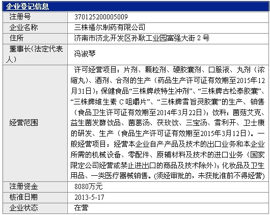三株福尔制药有限公司 公司简介: 三株福尔制药有限公司是目前世界上最大的发酵中药生产基地,它隶属于山东三株集团,是一家集科研、生产销售为一体的药品生产民营企业。公司位于济南市 济北开发区孙耿工业园富强大街2号,南面为济青高速公路,东临104国道,交通十分方便,环境优美,远离居民生活区,四周无任何污染源。厂区内环境整洁, 整体布局合理,道路畅通,配套设施齐全。厂区占地面积62102平方米,建筑占地面积27885平方米,绿化面积32250平方米。厂区内有综合制剂车 间、中药前处理车间、中心化验室、综合仓库、中药材库、危险品库及门卫等建筑设施。 企业注册基本信息: