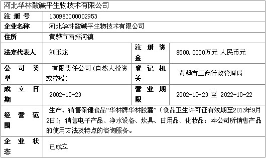 河北华林酸碱平生物技术有限公司 公司简介: 河北华林酸碱平生物技术有限公司,是河北华林集团旗下的全资子公司,是一家专业研制、生产、销售功能型健康食品的实体企业。华林酸碱平生物技术有限公司成立于2003年,至今已累积投资一亿元人民币,建成占地32000平方米的国际GMP等级标准生产基地,同时投入巨资建成了万亩碱性紫花苜蓿种植园,以确保高品质原材料的供应,满足企业可持续发展的战略需要。公司拥有自己的技术研究所和专家课题组,权威专家及科学工程技术人员148人,并成立了以天津南开大学生物化学与分子生物学李建民教授为所长的、全球首家专门研究人类酸碱平衡的研究所---北京华林维尔酸碱平衡生物技术研究所。其研发生产的酸碱平系列产品大力倡导中华民族的食疗文化,专门纠正人体酸性体质,保障人体健康,造福全人类。这一国内首创、国际领先的产品,得到国务院副总理回良玉的高度评价,有关专家和政府有关部门正在向全社会推广,产品上市后已经受到广大消费者的青睐。 企业注册基本信息: