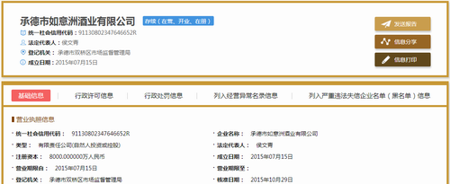 【直报网北京2月6日讯】(直销头条网)直销人透露,承德市如意洲酒业有限公司(以下简称承德如意洲)采用直销模式运作市场。 ![]() 据官网资料显示,承德如意洲酒业有限公司(原名:如意酒厂)成立二十多年,生产浓香型、清香型,高,中,低端白酒,消费者质量诚信级企业,注册资金八千万,生产基地位于双滦区单塔子村,130亩的生产基地(办公大楼、生产车间),职工有1000多人,4条生产流水线,年产总值20亿,有20多年的历史。 承德如意洲酒业有限公司传承了满清时期的古老酿酒方法,凭借承德优美的环境,幼稚充沛的水源,经过几代人精心打造,酿造出以“承德老酒”为龙头的优质白酒,多年来深受广大消费者的青睐。现因市场需要先后推出了家庭系列、喜宴系列、贵宾系列、珍藏系列、红酒系列、啤酒系列、饮品系列,不同档次不同度数的优质产品。以其清澈透明,芳香,浓郁,酒味香而不艳,纯而不腻,酒后不上头等优点,满足不同口味,不同层次的消费者对白酒的需求。 ![]() 直销头条网编辑在全国企业信用信息系统查询到承德如意洲公司在2015年07月15日注册,注册资金8000万人民币。法人是侯文青、王宗光。