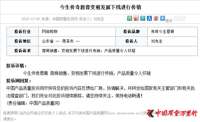 ![]() 消费者反映口红卸不掉 据本网了解,除了育发、染发、烫发、脱毛、美乳、健美、除臭、祛斑和防晒等9类化妆品, 其他的化妆品都叫做非特殊用途化妆品,也就是普通化妆品。 根据《化妆品监督管理条例(征求意见稿)》(以下简称《条例》)明确规定禁止标注的内容。包括明示或者暗示具有医疗作用;夸大功能、虚假宣传、贬低同类产品或者容易给消费者造成误解或者混淆的内容等。其中特别提出,化妆品的功效宣称应当有充分的实验或者评价数据支持。产品宣称经功效验证机构测试并出具报告的,产品标签中可以标注相关验证信息;未经验证的,应当在描述宣称的功效作用内容结尾标注“上述功效未经验证”等字样。 化妆品广告不得使用他人名义保证或者暗示使得消费者误解其效用。发布虚假化妆品广告的,由省级以上人民政府食品药品监督管理部门决定暂停销售该化妆品,并向社会公布;仍然销售的,将被没收违法所得、违法销售的化妆品,并处2万元以上5万元以下罚款。 多级代理模式涉嫌传销 ![]() 传奇今生红樱桃健康唇膏代理制度 ![]() 奖金制度详情 受害者郑女士表示:“广州富诚国际控股有限公司主要利用传奇今生品牌红樱桃润唇膏开展传销业务,先交了1250元购买产品唇膏,作为入门费加入代理资格。其次,拉我入微信群,群里培训说运作方式是取得代理资格后才能发展下线,形成层级返利关系,而利润来源是,只有发展下线,才有利润,下线人数越多,利润越大,代理级别越高,利润越大,并享受有团队计酬。” ![]() 中国质量投诉网 ![]() 受害者提供举报信息 本网发现,不少平台对传奇今生红樱桃健康唇膏的代理方式提出过质疑。而根据我国《禁止传销条例》第七条规定,下列行为属于传销行为: (一)组织者或者经营者通过发展人员,要求被发展人员发展其他人员加入,对发展的人员以其直接或者间接滚动发展的人员数量为依据计算和给付报酬(包括物质奖励和其他经济利益,下同),牟取非法利益的; (二)组织者或者经营者通过发展人员,要求被发展人员交纳费用或者以认购商品等方式变相交纳费用,取得加入或者发展其他人员加入的资格,牟取非法利益的; (三)组织者或者经营者通过发展人员,要求被发展人员发展其他人员加入,形成上下线关系,并以下线的销售业绩为依据计算和给付上线报酬,牟取非法利益的。 ![]() 直到本网采访结束,仍有不少的受害者加入该群,部分受害者表示已经报警。本网多次拨打广州富诚国际控股公司电话均无人接听。随后通过天眼查发现,该公司被广州市工商行政管理局列入经营异常。