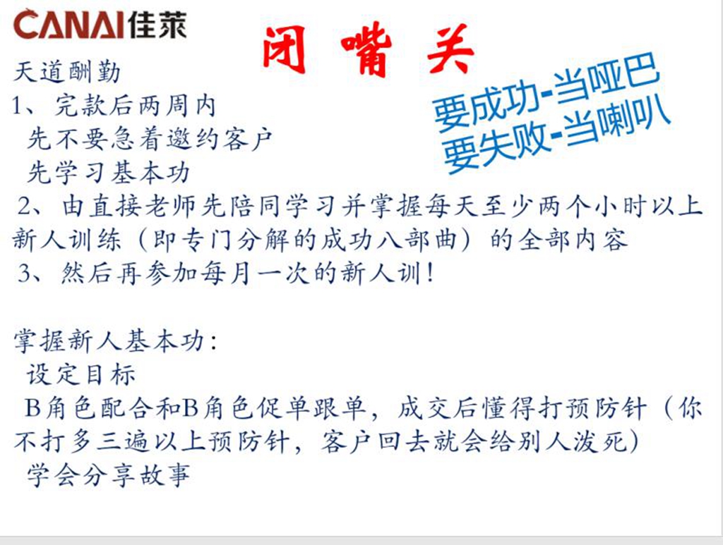 ![]() (佳莱培训资料) 根据《禁止传销条例》第二条规定,传销是指组织者或者经营者发展人员,通过对被发展人员以其直接或者间接发展的人员数量或者销售业绩为依据计算和给付报酬,或者要求被发展人员以交纳一定费用为条件取得加入资格等方式牟取非法利益,扰乱经济秩序,影响社会稳定的行为。 5月8日,市场监管总局发布《关于做好2019年传销重点城市、重点地区打击整治工作的通知》,通知指出,涉嫌网络传销的市场主体注册地主要集中在广东、北京、山东、江苏、浙江、上海省(市),需要创新工作措施加强重点整治。