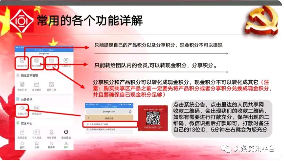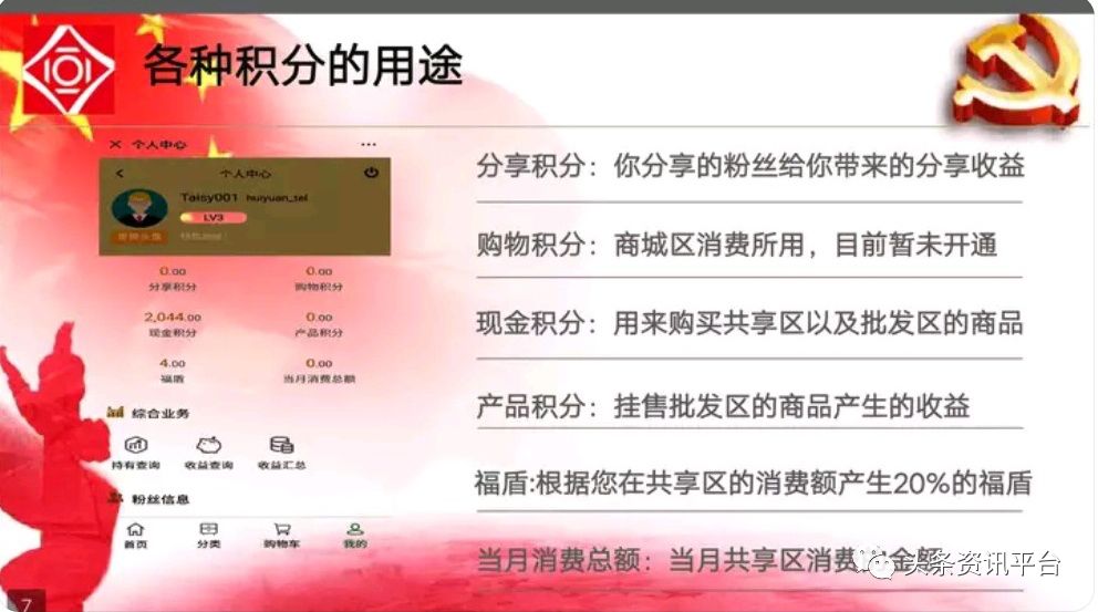 利润共享,消费赚钱 下面,我们来看看人民共享网是怎样一个共享流程。 首先登录www.jhrmgx.com,消费者可以免费注册成为人民共享网会员,然后到安全中心填写收货地址。然后就是现金充值,(1元=1个消费余额)。获取消费余额后,进入共享区,在商城使用余额购买商品。点击套装价格,(变绿色),再点击购买数量,点下面标明地址的小方块(变蓝色),最后点购买,输安全密码点确定。购买商品的区域,花费商品原价购买,大概25-30天左右由工厂直接包邮到家。同时获得消费额20%的福盾。 有了福盾以后,就可以在批发区进行批货,点击你选定的批发产品再点出售(按表格要求填写),然后会消耗相应配额的批发价以及福盾。在批发区使用余额和福盾可以以不同套餐抢购到最低一折的批发价商品。 在所有购买完成后,即可按照原价出售你在批发区购买的商品。可以委托商城代售,并显示在挂售中心。挂售的那些会员,可以获得一定比例的奖金到收益账户。(零售价格-批发价格)*百分比*数量。共享区和批发区,资金比例为2:8或3:7。 委托的商品出售成功后,按照出售价格的80%的货款将以余额的形式到余额账户上。五天后,你这一期的收益就到账了,收益率为7~10%。每个月6期,月收益42~60%(如一万块钱的消费总额,每月六期操作后,有4200到6000的收入) 最后就是提现了,只能提现自己的产品积分以及分享积分,不可以提现现金积分。消费余额可以随时提现,提现收取9%现金或5%GGM手续费,提现以百元为单位。 举个例子,比如,首轮以500元零售价购入红酒,获得福盾100,第二轮1折50元批发两盒茶叶,成本100元。在零售价500元售出,得到2件*500元=销售额1000元。(800元可提现+50元购物积分)得到利润700元+50元购物积分。 ![]() ![]() ![]() ![]() 再来看看消费者的收益有哪些: 1. 商品出售后,消费者获得80%的货款。 2. 当月本人消费流水达到2万元以上,自动转换成消费商。 3. 消费商直接分享的消费者,可享受5%的消费流水奖励。 各种积分详解: 1. 分享积分:你分享的粉丝给你带来的分享收益。 2. 购物积分:商城区消费所用,目前暂未开通。 3. 现金积分:用来购物共享区以及批发区的商品。 4. 产品积分:挂售批发区的商品产生的收益。 5. 福盾:根据您在共享区的消费额产生20%的福盾。 6. 当月消费总额:当月共享区消费的金额。 ![]()
