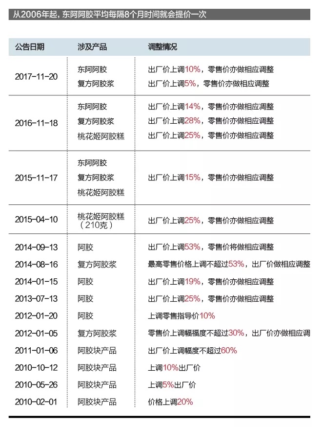 所谓价值回归就是提价。从2006年起,东阿阿胶平均每隔8个月时间就会提价一次。其中,2010-2017年,东阿阿胶提价11次,零售价从130元/千克涨至5400元/千克,涨幅超过40倍。而涨价缘由,基本归咎于驴皮原材料供应紧张(稀缺),科技创新带来产品溢价(价值认同)。