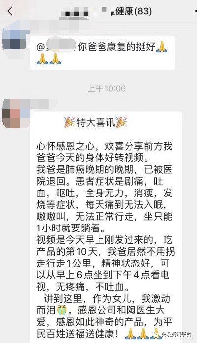 包治百病,宣传夸张 眼下,在“渡慈航商贸总部社群”里,还有其他的推广人员通过宣传材料介绍其产品“花仙伊蔓雪域酵素”具有的诸多功效。 ![]() 在该群中,每天都有人按时发放用以引流的“营销券红包(红包可以用于在兑换中心兑换产品)”,也有推广人员以“案例”的形式推广其产品。 ![]() 通过下面这些图片,我们可以看到他们在明示或暗示囊肿积液、慢性肾炎、盆腔积液、三高、肾结石、痛经、感冒发烧、子宫肌瘤等病症都能通过服用他们的酵素来治愈。 ![]() ![]() ![]() ![]() 包括肝癌、乳腺癌和肺癌在“群主”的口中都能通过服用雪域酵素这款产品而康复起来,并附有聊天截图,堪称包治百病。 ![]() ![]() ![]()