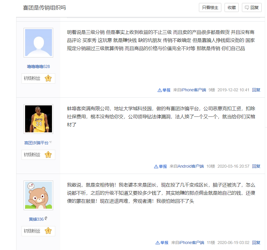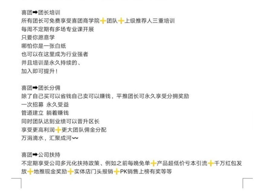 成为团长后不仅可以购物享受30%左右的优惠,还可以通过分享的方式赚钱。有网友表示,当你做了团长后就会诱使你去做区长,而要想做区长就必须在自己名下开发新的团长,达到一定人员后即可成为区长,而这样其实就是拉人头。而舆情观察网注意到,喜团公开对外宣传为横向发展无限层,纵向发展三层的代理模式。