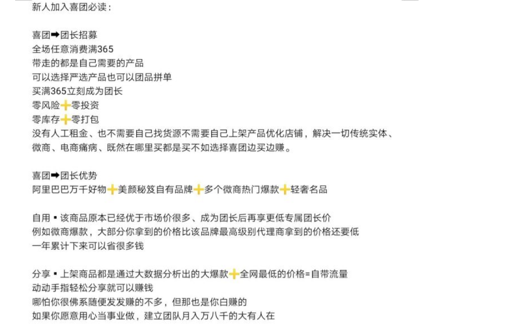 日入上万元的分销代理模式? 截图来自:微博 此外,舆情观察网注意到,喜团是一个号称自用省钱分享赚钱的电商平台,0投资0风险0囤货,只要掌握了一定