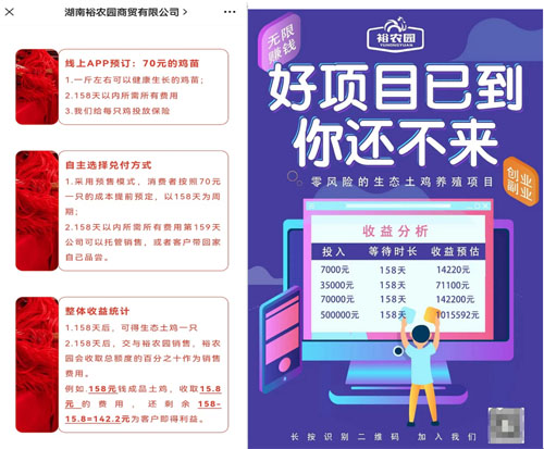 【直报网北京8月5日讯】(北青网)日前,北青网健康在中国裁判文书网上发现一则题为《益阳市市场监督管理局非诉财产保全审查非诉保全审查裁定书》(简称:《非诉保全审查裁定书》),湖南裕农园商贸有限公司及关联人员因涉嫌传销被益阳市郝山区人民法院冻结银行账户资金共计4亿元。 ![]() 截图来自中国裁判文书网 据《非诉保全审查裁定书》显示,益阳市市场监督管理局于2022年4月28日对湖南裕农园商贸有限公司涉嫌网络传销的行为立案调查。现益阳市市场监督管理局根据《禁止传销条例》第十四条第一款第(八)项的规定,向益阳市赫山区人民法院申请财产保全,请求冻结被申请人湖南裕农园商贸有限公司、欧阳熹、李又有、李莉的银行存款各100000000元或查封、冻结其他等额财产。 益阳市赫山区人民法院经审查认为,益阳市市场监督管理局的申请符合法律规定,依照《中华人民共和国XX诉讼法》第一百零一条,《中华人民共和国民事诉讼法》第一百零五条、第一百零六条、第一百零八条,《最高人民法院关于适用<中华人民共和国XX诉讼法>的解释》第一百五十九条的规定,裁定如下: 一、冻结被申请人湖南裕农园商贸有限公司的银行存款100000000元或查封、冻结其他等额财产; 二、冻结被申请人欧阳熹的银行存款100000000元或查封、冻结其他等额财产; 三、冻结被申请人李又有的银行存款100000000元或查封、冻结其他等额财产; 四、冻结被申请人李莉的银行存款100000000元或查封、冻结其他等额财产。 据企查查显示,湖南裕农园商贸有限公司(简称:裕农园商贸)成立于2020年6月30日,注册资金1000万元,实缴1000万元。公司法人代表、大股东及实际控制人均为欧阳熹。值得注意的是,欧阳熹名下关联的企业有湖南裕农园控股集团有限公司、湖南裕农园优品食品有限公司、邵阳市裕农园农业发展有限公司、长沙农富企业管理有限公司等。 ![]() 收益模式截图 据裕农园商贸公司官方公众号上发文显示,2021年养鸡的前景十分不错,公司的养鸡项目为低投入、零风险、高回报,投入越多收入越高。客户仅需70元提前预定一只鸡,158天后即可获得生态土鸡一只,客户可以将鸡领回家中品尝,也可选择让公司托管销售。裕农园则会从中收取10%作为销售费用。例如158元的成品鸡,收取15.8元费用,那么158-15.8=142.2元,即为客户获得的剩余利润。投入7000元预估收益为14220元、投入35000元预估收益为71100元、投入500000元预估收益可达1015592元。