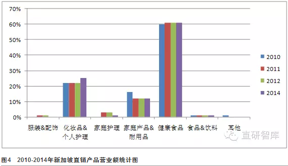 图3 2010-2012年新加坡直销从业者男女比例情况 直销产品结构 新加坡直销产品结构丰富,包含有服装&服饰、化妆品&个人护理、家庭护理、家庭产品&耐用品、健康食品、食品&饮料及其他。产品的覆盖面尽管不如直销发达国家那样涵盖家庭装修、金融服务、公用事业这些方面,但是也基本覆盖了我国直销产品的范围。所以我们的直销企业要进军投资新加坡市场,在产品种类上应该可以说是无缝对接的。从我们在世界直销协会联盟统计到的关于直销产品方面的数据(由于2013年未进行过此项统计,所以该年数据未计入),健康食品在七类产品中的领先地位不容撼动,其次是化妆品&个人护理与家庭产品&耐用品具有相对较高的市场份额。因此,在产品的市场占有率上,新加坡与我国还是有些不同的,但是由于我国大健康产业的兴起,在健康食品的贡献上存在一定的优势,这对于我国直销企业开拓新加坡市场也是极为有利的。从图4的统计数据来看,各类产品的年增长率并不大,也就是说目前各类产品的销售形态已经固定,这可以说是成熟直销市场的一个特点。由于有严格的法律制约,新加坡对于消费者的权益保护做得更好,消费者在投诉后,被投诉公司将需要面临相当繁杂的调查程序,在这一点上如果没有很好的产品作根基,想在新加坡做好直销是相当困难的。 |