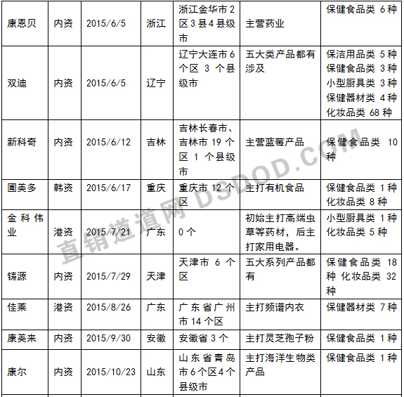 【直报网北京2月2日讯】(直销道道网)2015年时值《直销管理条例》、《禁止传销条例》颁布十周年,各种密集的行业活动、各项政策的利好、鼓舞人的数据、以及各位高规格人士的总结、讲话无不透露一个信息,中国直销行业发展趋势见好,将要迎来最佳的发展时期。 道道舆情监控室整理发现,截止2015年12月31日,获得直销牌照的企业总数量达到71家。而仅2015年一年内,获得商务部核发直销牌照的有23家企业。这样的速度让很多人感慨,直销行业看来是要真的爆发了。下面,就来看看这一年里都有哪些企业获得了直销牌照? 2015年获牌情况: 备注: ①上表中企业的获牌时间、授权区域、核准产品及数量均按照商务部直销行业信息管理系统的公示所列,且时间截止为2015年12月31日。 ②上面表格中的主打理念/主营产品均由道道舆情监控室根据企业的官方网站信息所提炼,如有出入请以企业官方信息为准。 |
