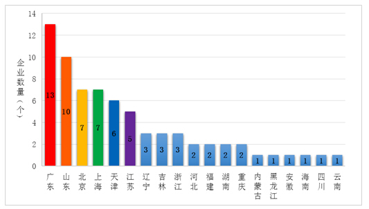 图1:2012-2015年直销企业数量 地区分布。直销企业分布在19个省、自治区、直辖市,比2014年增加了4个地区(内蒙古、河北、重庆、安徽)。直销企业数量最多的5个地区为广东、山东、北京、上海、天津,共有直销企业43家,占企业总数的61%。