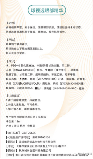 话说回来,一般来讲,产品的委托方就是代理方,那么球视远这一款产品还存在两个代理?经查国产非特殊用途化妆品备案平台,我们发现产品名称中带有“球视远”这三个字的产品共有两款,分别是2020年7月备案的球视远眼部精华液(备案编号:苏G妆网备字2020003861),以及2021年4月备案的球视远眼部精华,这两款产品的实际生产企业都是杭州诚林生医科技有限公司,不同之处在于前者的委托企业是江苏魅值生物科技有限公司,后者的委托企业是无锡魅购优品生物科技有限公司。