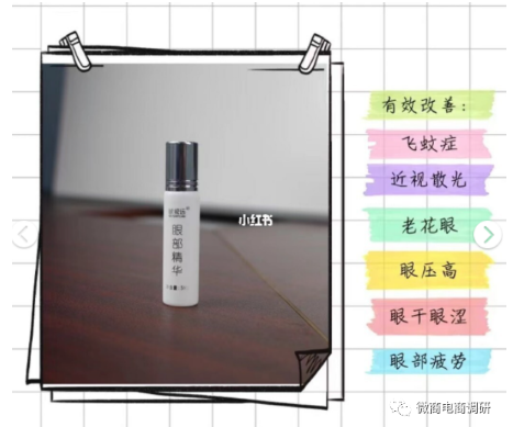 在小红书上,也有推广人员明确表示:怕近视,散光,飞蚊症,黑眼圈,眼袋,鱼尾纹,眼睛干涩,泪沟,用球视远。还有宣传图片显示,球视远眼部精华能有效调理、预防、保健因衰老产生的各种眼部疾病和亚健康。