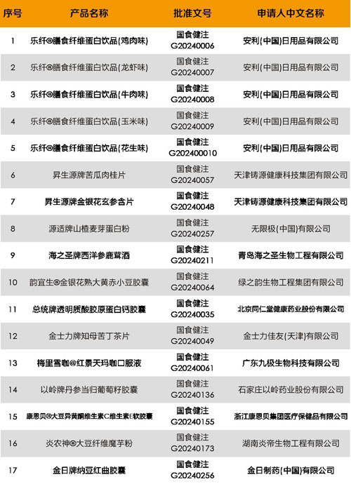 【直报网北京7月16日讯】(倍增商业评论)近日,“NHNE健康营养博览会”根据国家市场监督管理总局官方网站整理的保健食品注册产品内容显示,截至2024年7月1日,全国共有271款保健食品获得备案凭证,其中含有批文转让获批产品26款。2024上半年我国保健食品全部获批名单见今天推送文章的第二条文后。 依据获批产品名录,我们梳理了直销企业的获批产品名录,具体名单如下: ![]() 245款保健食品新注册产品中,直销企业注册17款,占比总数量的6.94%。