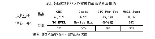众所周知,人均业绩从某种程度上可以反映企业营销队伍的整体竞争力和运营效率,人均业绩低的企业应在企业内部管理,诸如组织结构、业务流程、企业员工、企业文化等因素,开展适当的调查和调整,以突破瓶颈,寻求发展。研究发现,韩国106家MLM企业的人均营业额为3960元,超过该均数的MLM企业有52家(占比49%)。纵观MLM行业,人均营业额之间存在较大悬殊(见表1)。