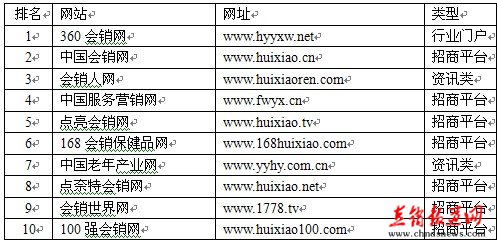 【直报网2月11日讯】(东北新闻网报道)中国工业网讯由健康产业行业联盟主办的2014我最爱的会销网评选经过几轮筛选,最终评选公布,以招商平台模式为代表的360会销网和中国会销网分别占居第一、第二名,以资讯类为主的会销人网紧随其后,会销行业其它平台如:老年产业杂志及会销圈杂志因在网络平台方面欠缺未得到好排名。2014会销网站排名结果如下: