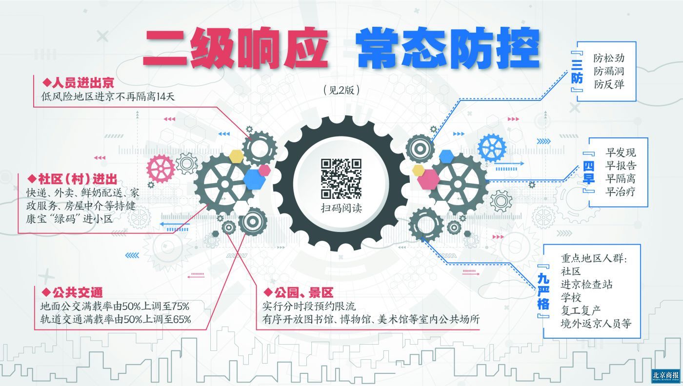 响应级别调至二级 “目前北京疫情防控安全屏障稳固,总体风险可控。”陈蓓在发布会上表示。她介绍,从全国看,目前疫情持续向好。截至4月28日24时,23个省区市超过28天无新增本土病例报告;24个省区市超过14天无新增本土病例报告。目前全国各省区市保持应急响应一级4个、二级6个、三级19个、四级3个,28个省区市相继调整了响应级别,并未发现疫情反弹。同时,从4月8日武汉解封至目前经过三周时间的监测检测,没有疫情反弹。 从北京市看,截至4月28日24时,15个区超过36天无新增本土病例报告,其中12个区70天以上无本土新增病例,朝阳区今日24点,将14天无新增本土病例报告。同时,自3月23日中央决定北京口岸国际航班加降第一入境点后,北京直接入境客运航班旅客减少,并全部实行集中观察,全面进行核酸检测的严格管理。虽有零星境外输入病例,但感染来源明确,溯源清晰,疫情防控整体平稳可控。 “综合考虑以上情况,本市调低一级应急响应等级的内外部条件已基本具备。”陈蓓说,“但应急响应级别的调整绝不意味着防控工作标准降低、防控力度减弱,而是对防控工作提出了新的更高要求。” 据介绍,响应级别调整后,北京仍将实行九“严格”:严格社区管控,继续实行封闭式管理。严格进京检查站管理。严格学校常态化管理。严格复工复产管理。严格落实常态化监测,对重点人群应检尽检。严格就医管理,建立实名制预约常态机制;严格院感防控升级版措施,彻底阻断院内疫情的传播。严格境外返京人员管理。严格落实四方责任。严格个人卫生管理,落实文明促进条例,倡导健康公约。 在此基础上,将有序动态调整防控措施。坚持外防输入、内防反弹不放松,遵循严实、精准、有序、动态原则,科学有效对部分防控策略进行调整。