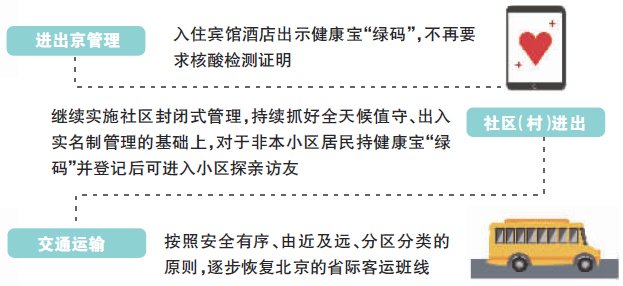 交通运输 逐步恢复长途客运业务 在交通运输上,按照安全有序、由近及远、分区分类的原则,逐步恢复北京的省际客运班线,现行恢复途经和终到地均为低风险地区的客运班线,暂不恢复中高风险地区的客运班线,待中高风险地区降为低风险时,适时予以调整。湖北(含武汉)地区返京人员继续按照此前方式,保持有组织、“点对点”、全程闭环管理工作机制不变。 |