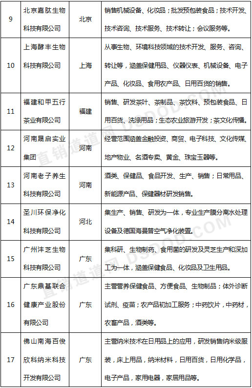 【直报网北京9月1日讯】(直销道道网) 一直以来,传统企业涉足、转型直销的话题从未消退过,而值得注意的是,近两个月似乎成了传统企业涉水直销的“旺季”,众多传统企业相继被曝采用直销模式运作市场。据道道舆情监控室长期监控发现,经过考证核实确有涉足直销模式的企业就有21家(详情见下表)。对于大多数人来说,这其中大部分企业都是极为陌生的,甚至从未听过。而对于直销企业来讲,这些正在徘徊于直销大门前的企业,无疑是他们面临的一群隐形的竞争对手,认识、了解它们极为必要。 现道道舆情监控室从企业主营方向、注册信息以及市场运作等方面着手,分析目前涉足直销这一类企业整体情况,同时也希望能够让直销企业以及广大行业人对此有更多的了解。 被曝涉水直销的21家企业: