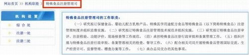【直报网北京4月26日讯】(庶正康讯)4月23日,庶正康讯技术法规部监测发现:国家食药总局(下称CFDA)官网赫然列出「特殊食品注册管理司」的工作职责及下设机构。 据了解,特殊食品注册管理司共七大职责—— 职责明细 研究拟订保健食品、婴幼儿配方乳粉产品、特殊医学用途配方食品等特殊食品(下称特殊食品)注册管理制度并组织监督实施。 研究拟订特殊食品注册管理技术规范并组织实施。 研究拟订特殊食品注册审评、注册检验、功能评价、现场核查等工作规范。 承担特殊食品注册行政审批和备案管理工作。 组织开展与特殊食品注册行政审批、备案管理相关的检查、督导工作。 配合相关司局开展特殊食品管理国际交流、生产经营许可、监督管理、稽查办案等工作。 承办总局交办的其他事项。 特殊食品注册管理司下设三大部门—— 综合处-六大职责 组织特殊食品注册管理信息化相关工作。 组织特殊食品注册相关技术支撑体系建设。 组织对特殊食品注册备案相关工作的检查考核工作。 组织研究分析特殊食品注册管理形势、存在问题并提出措施建议。 承担特殊食品管理工作的国际、国内交流与合作等工作。 承担司综合文稿起草、会议组织、公文处理、文书档案、政务信息、督查督办、安全保密、资产管理等综合工作。 注册一处-五大职责 组织拟订保健食品注册行政审批和备案管理制度。 组织拟订保健食品注册、备案技术规范和工作规范。 组织拟订保健食品原料目录和保健功能目录管理制度。 承担保健食品注册行政审批、备案管理及指导工作。 组织开展与保健食品注册行政审批、备案管理相关的检查、督导工作。 注册二处-四大职责 组织拟订婴幼儿配方乳粉产品、特殊医学用途配方食品注册管理制度。 组织拟订婴幼儿配方乳粉产品、特殊医学用途配方食品注册技术规范和工作规范。 承担婴幼儿配方乳粉产品、特殊医学用途配方食品注册行政管理及指导工作。 组织开展与婴幼儿配方乳粉产品、特殊医学用途配方食品注册行政审批相关的检查、督导工作。