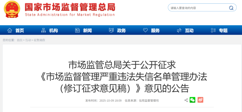 【直报网北京10月16日讯】(市场监管总局)10月9日,国家市场监督管理总局对《市场监督管理严重违法失信名单管理办法(修订征求意见稿)》(以下简称《办法》)进行公开征求意见,意见反馈截至11月10日。
