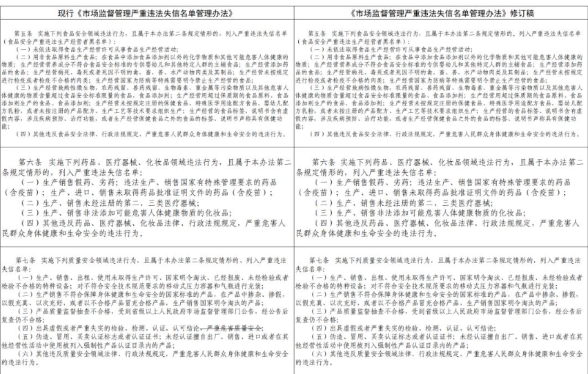图源:《市场监督管理严重违法失信名单管理办法(修订征求意见稿)》新旧条文对照表 以下为《市场监督管理严重违法失信名单管理办法(修订征求意见稿)》 第一条 为了规范市场监督管理部门严重违法失信名单管理,强化信用监管,扩大社会监督,促进诚信自律,依照有关法律、行政法规,制定本办法。 第二条 当事人违反法律、行政法规,性质恶劣、情节严重、社会危害较大,受到市场监督管理部门较重行政处罚的,由市场监督管理部门依照本办法规定列入严重违法失信名单,通过国家企业信用信息公示系统公示,并实施相应管理措施。 前款所称较重行政处罚包括: (一)依照行政处罚裁量基准,按照从重处罚原则处以罚款; (二)降低资质等级,吊销许可证件、营业执照; (三)限制开展生产经营活动、责令停产停业、责令关闭、限制从业; (四)法律、行政法规和部门规章规定的其他较重行政处罚。 第三条 国家市场监督管理总局负责组织、指导全国的严重违法失信名单管理工作。县级以上地方市场监督管理部门依照本办法规定负责严重违法失信名单管理工作。 第四条 市场监督管理部门应当按照规定将严重违法失信名单信息共享至全国信用信息共享平台,并按规定与其他有关部门共享,依照法律、行政法规和党中央、国务院政策文件实施联合惩戒。 第五条 实施下列食品安全领域违法行为,且属于本办法第二条规定情形的,列入严重违法失信名单(食品安全严重违法生产经营者黑名单): (一)未依法取得食品生产经营许可从事食品生产经营活动; (二)用非食品原料生产食品;在食品中添加食品添加剂以外的化学物质和其他可能危害人体健康的物质;生产经营营养成分不符合食品安全标准的专供婴幼儿和其他特定人群的主辅食品;生产经营添加药品的食品;生产经营病死、毒死或者死因不明的禽、畜、兽、水产动物肉类及其制品;生产经营未按规定进行检疫或者检疫不合格的肉类;生产经营国家为防病等特殊需要明令禁止生产经营的食品; (三)生产经营致病性微生物,农药残留、兽药残留、生物毒素、重金属等污染物质以及其他危害人体健康的物质含量超过食品安全标准限量的食品、食品添加剂;生产经营用超过保质期的食品原料、食品添加剂生产的食品、食品添加剂;生产经营未按规定注册的保健食品、特殊医学用途配方食品、婴幼儿配方乳粉,或者未按注册的产品配方、生产工艺等技术要求组织生产;生产经营的食品标签、说明书含有虚假内容,涉及疾病预防、治疗功能,或者生产经营保健食品之外的食品的标签、说明书声称具有保健功能; (四)其他违反食品安全法律、行政法规规定,严重危害人民群众身体健康和生命安全的违法行为。 第六条 实施下列药品、医疗器械、化妆品领域违法行为,且属于本办法第二条规定情形的,列入严重违法失信名单: (一)生产销售假药、劣药;违法生产、销售国家有特殊管理要求的药品(含疫苗);生产、进口、销售未取得药品批准证明文件的药品(含疫苗); (二)生产、销售未经注册的第二、三类医疗器械; (三)生产、销售非法添加可能危害人体健康物质的化妆品; (四)其他违反药品、医疗器械、化妆品法律、行政法规规定,严重危害人民群众身体健康和生命安全的违法行为。 第七条 实施下列质量安全领域违法行为,且属于本办法第二条规定情形的,列入严重违法失信名单: (一)生产、销售、出租、使用未取得生产许可、国家明令淘汰、已经报废、未经检验或者检验不合格的特种设备;对不符合安全技术规范要求的移动式压力容器和气瓶进行充装; (二)生产销售不符合保障身体健康和生命安全的国家标准的产品,在产品中掺杂、掺假,以假充真、以次充好,或者以不合格产品冒充合格产品,生产销售国家明令淘汰的产品; (三)产品质量监督抽查不合格,受到省级以上人民政府市场监督管理部门公告,经公告后复查仍不合格;(四)出具虚假或者严重失实的检验、检测、认证、认可结论; (五)伪造、冒用、买卖认证标志或者认证证书;未经认证擅自出厂、销售、进口或者在其他经营性活动中使用被列入强制性产品认证目录内的产品; (六)其他违反质量安全领域法律、行政法规规定,严重危害人民群众身体健康和生命安全的违法行为。 第八条 实施下列侵害消费者权益的违法行为,且属于本办法第二条规定情形的,列入严重违法失信名单: (一)侵害消费者人格尊严、个人信息依法得到保护等权利; (二)预收费用后,为逃避或者拒绝按照约定提供商品或者服务,在决定停业或者迁移服务场所时未依法提前告知消费者并提供有效联系方式等信息; (三)制造、销售、使用以欺骗消费者为目的的计量器具;抄袭、串通、篡改计量比对数据,伪造数据、出具虚假计量校准证书或者报告,侵害消费者权益; (四)经责令召回仍拒绝或者拖延实施缺陷产品召回; (五)其他违反法律、行政法规规定,严重侵害消费者权益的违法行为。 第九条 实施下列破坏公平竞争秩序和扰乱市场秩序的违法行为,且属于本办法第二条规定情形的,列入严重违法失信名单: (一)侵犯商业秘密、商业诋毁、组织虚假交易等严重破坏公平竞争秩序的不正当竞争行为; (二)故意侵犯知识产权;提交非正常专利申请、恶意商标注册申请损害社会公共利益;从事严重违法专利、商标代理行为; (三)价格串