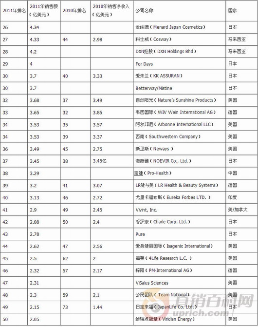 直报网北京4月19日电(直销百科网报道)2012年4月17日,美国著名直销新闻网(DSN)发布了2011年全球直销100强初步榜单,该榜单所收录的均为全球直销企业收益最好的公司。DSN表示,最终的榜单结果将在他们的6月刊中发布。 为了确保结果的公开性和透明性,2011年DSN实施了新的标准:收入证明表(RFC)。为了从侧面反映,DSN要求每家直销公司的首席执行官和首席财务官或指定的代理机构提交一份收入证明文件。 全球直销企业100强是根据企业支付佣金之前以及没有任何增值税的情况下确定的。在DSN的研究中,他们鉴定了超过100家拥有排名资格的直销企业。然而,因为新的标准的制定,DSN只选取了那些提供了收入证明的直销企业。 DSN方面表示,他们相信,新的标准将能更清晰地展示直销企业高端部分的表现情况。根据该榜单显示,美国直销企业仍占据大半江山。雅芳依然全球领先,安利居第2位,康宝莱排名第3,玫琳凯排名第6,如新排名第9,爱茉莉排名第16,优莎娜排名第17,嘉康利排名第21,科士威排名第27,宝健排名第38,隆力奇排名第57。 另外,无限极、美乐家、完美、仙妮蕾德、天狮、立新世纪、月朗国际、三生也在DSN的考证之列。以下是排行榜单: