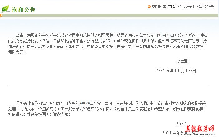 【直报网10月23日讯】(直销道道网)近日,广东润和实业发布公告,董事长陈建军称,自10月15日开始,将把拖欠消费者的货物分期分批发给各位。由此看来,三个月前被广东珠海工商定义为传销的润和实业再次回到了业界。 在公告中提到的拖欠消费者货物事件,实际指的是,4月份媒体曝出广东润和在湖南因经销商报单款项被卷遭举报,而后湖南怀化警方将广东润和除董事长赵建军之外的高管20余人在珠海全部缉拿归案。 通过润和实业官网发布的两篇公告,该企业或许有东山再起的可能。▲ (原标题:广东润和实业死灰复燃 董事长赵建军安抚市场) 责任编辑:宝蓝 |