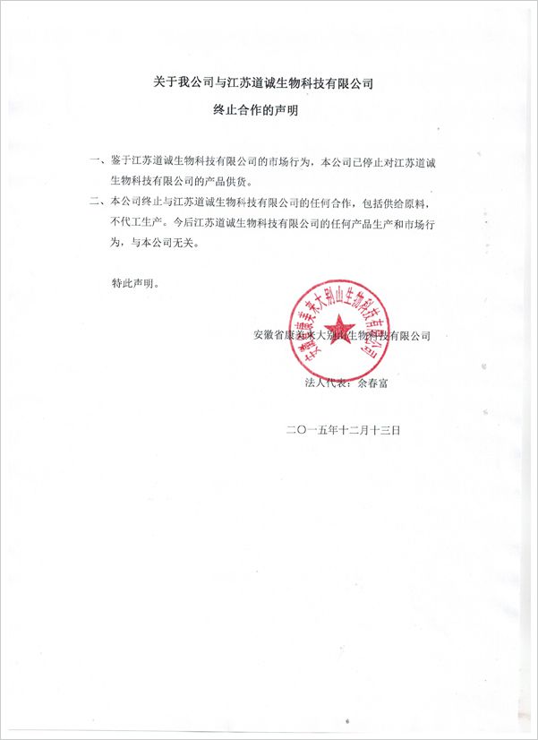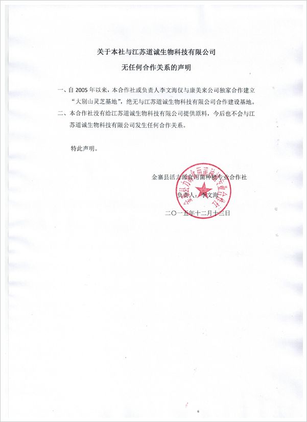 【直报网12月16日讯】(新华商)近日,新华商网记者于12月14日在安徽省康美来大别山生物科技有限公司官网发现其刊登了两则与江苏道诚生物科技有限公司的声明,第一条是终止与江苏道诚生物科技有限公司的合作声明,另一条则是以金寨县活力源食用菌种植专业合作社的名义发布的与江苏道诚生物科技有限公司无任何合作关系的声明。新闻一前一后,可见安微省康美来大别山生物科技有限公司之前确与江苏道诚生物公司有合作关系,只因江苏道诚生物有限公司某些市场行为导致安微省康美来大别山生物科技有限公司决定停止对其的产品供货以及不再代工生产。 从第二则以金寨县活力源食用菌种植专业合作社的名义发出的与江苏道诚生物公司无任何合作关系声明中,了解到自2005年以来,金寨县活力源食用菌种植专业合作社负责人李文海仅仅是与康美来公司独家合作建立“大别山灵芝基地”,并没有与江苏道诚生物科技有限公司合作建设任何基地。同时声明从没有给江苏道诚生物公司提供过原料,今后也不会与江苏道诚生物公司发生任何合作关系。▲ (原标题:康美来发布与江苏道诚生物公司终止合作声明) 责任编辑:小申 解读新闻热点、呈现敏感事件、更多独家分析,尽在“直事儿”微信,扫描二维码免费阅读。
