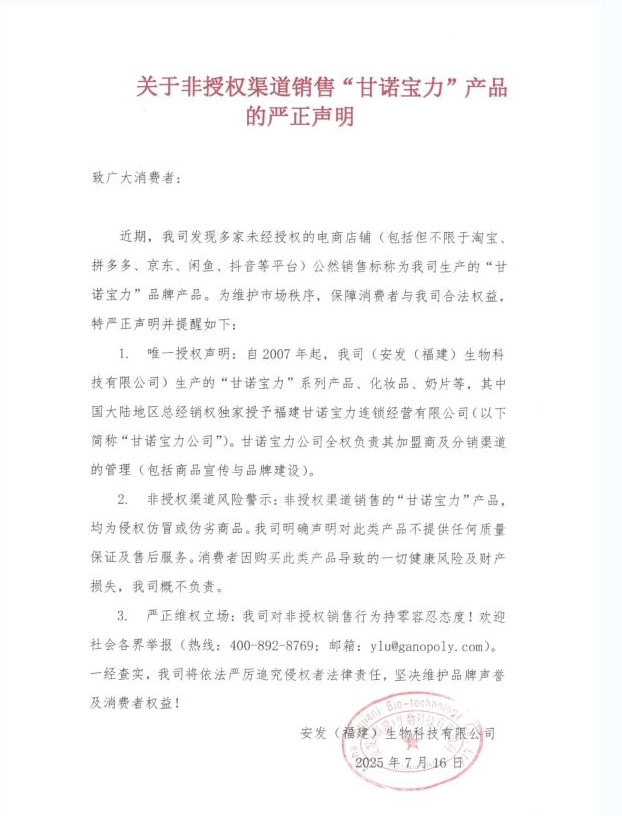 关于非授权渠道销售“甘诺宝力”产品的严正声明 【直报网北京7月18日讯】(安发) 致广大消费者: 近期,我司发现多家未经授权的电商店铺(包括但不限于淘宝、拼多多、京东、闲鱼、抖音等平台)公然销售标称为我司生产的“甘诺宝力”品牌产品。为维护市场秩序,保障消费者与我司合法权益,特严正声明并提醒如下: 1. 唯一授权声明:自2007年起,我司(安发(福建)生物科技有限公司)生产的“甘诺宝力”系列产品、化妆品、奶片等,其中国大陆地区总经销权独家授予福建甘诺宝力连锁经营有限公司(以下简称“甘诺宝力公司”)。甘诺宝力公司全权负责其加盟商及分销渠道的管理(包括商品宣传与品牌建设)。 2. 非授权渠道风险警示:非授权渠道销售的“甘诺宝力”产品,均为侵权仿冒或伪劣商品。我司明确声明对此类产品不提供任何质量保证及售后服务。消费者因购买此类产品导致的一切健康风险及财产损失,我司概不负责。 3. 严正维权立场:我司对非授权销售行为持零容忍态度!欢迎社会各界举报(热线:400-892-8769;邮箱:ylu@ganopoly.com)。一经查实,我司将依法严厉追究侵权者法律责任,坚决维护品牌声誉及消费者权益! 安发(福建)生物科技有限公司 2025年7月16日 (原标题:安发关于非授权渠道销售“甘诺宝力”产品的严正声明) 责编:九月 【特别声明:部分文字及图片来源于网络,仅供学习和交流使用,不具有任何商业用途,其目的在于传递更多的信息,并不代表本平台赞同其观点。版权归原作者所有,如涉版权或来源标注有误,请及时和我们取得联系,我们将迅速处理,谢谢!】 解读新闻热点、呈现敏感事件、更多独家分析,尽在以下微信公号,扫描二维码免费阅读。