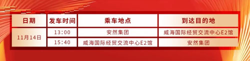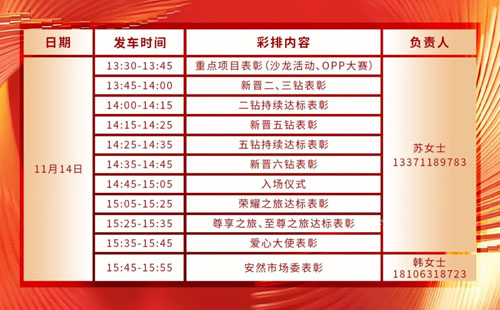 亲爱的安然家人们: 【直报网北京10月30日讯】(安然)安然2025年度营销表彰盛典在大家的期盼中即将隆重揭幕。为保证大会顺利进行,现将大会安排及彩排事宜通知如下: 活动安排 1.活动日期:2025年11月15日 2.入场时间:11:30开始入场-12:30结束入场 3.活动地点:威海国际经贸交流中心E2馆 4.着装要求:上台接受表彰人员女士着颜色艳丽的职业装、男士着商务正装 5.伴手礼领取:活动现场需本人凭票领取伴手礼,不可代领 6.活动接驳车辆安排 ![]() 温馨提示: 1.由于此次活动人数较多,伙伴可自行前往,也可乘坐公司接驳车辆前往,上车时请记住车号及下车地点,活动结束后乘坐同一车辆有序返程。 2.受表彰人员出席活动请携带身份证件,便于确认表彰区座位。 活动彩排安排 1.彩排时间:2025年11月14日,具体安排如图 ![]() 2.彩排地点:威海国际经贸交流中心E2馆 3.彩排要求: 1)请所有参与彩排人员准时入场,入场后听从工作人员安排在指定区域就座并严格遵守彩排纪律。 2)服从现场导演指挥,彩排顺序严格按照《彩排时间表》进行,请参与彩排人员务必按照指定时间到达会场。 3)请自行安排服装、道具、化妆等相关事宜。 4.彩排往返接驳车安排 ![]() 规范的彩排是为了保证大会的顺利进行。因此,本次彩排筹委会将严格按照规范执行,不考虑任何个人因素,请伙伴们给予支持与理解,感谢您的配合!具体事宜请咨询相关负责人。 安然2025年度营销表彰盛典
