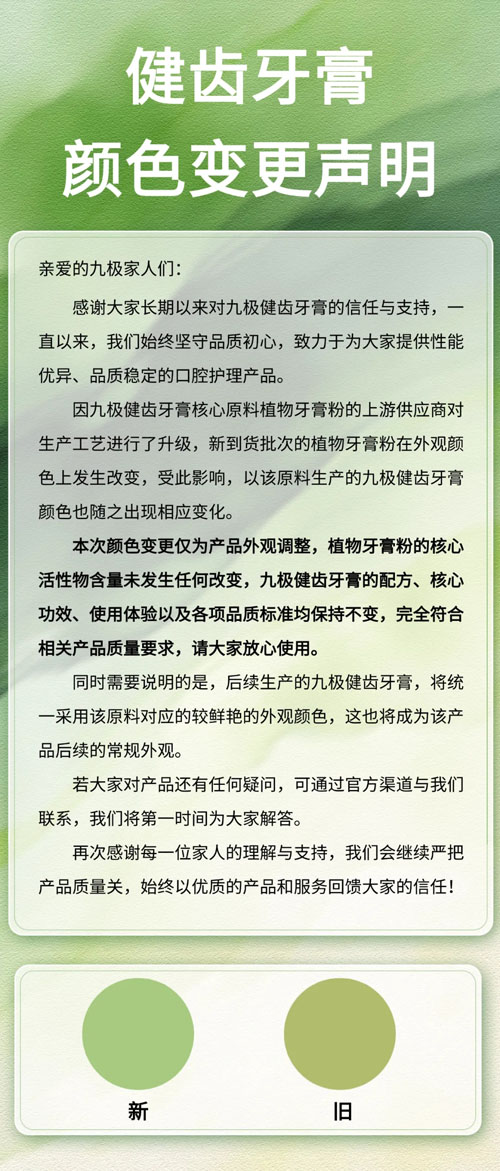 注:因屏幕显示效果差异,图片与实物可能存在轻微色差,产品颜色请以实物为准,敬请谅解。 (原标题:九极生物发布关于健齿牙膏颜色变更声明) 责任编辑:一一 【特别声明:部分文字及图片来源于网络,仅供学习和交流使用,不具有任何商业用途,其目的在于传递更多的信息,并不代表本平台赞同其观点。版权归原作者所有,如涉版权或来源标注有误,请及时和我们取得联系,我们将迅速处理,谢谢!】 解读新闻热点、呈现敏感事件、更多独家分析,尽在以下微信公号,扫描二维码免费阅读。