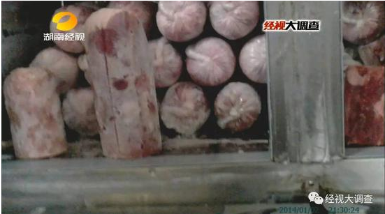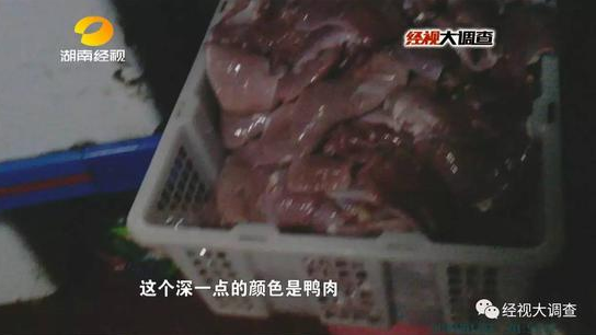 一位工人把去皮鸭大胸放入绞肉机中,把鸭肉打碎,掉到地上的鸭肉又被捡起来重新利用。 |