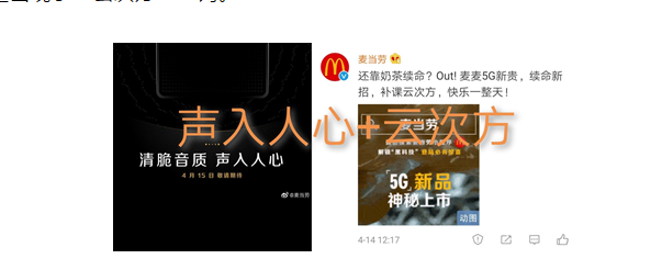 【直报网北京4月17日讯】(新浪科技)2020年还未过半,魔幻的事情又多了一件。 在吊足了所有人胃口之后,麦当劳4月15日正式推出了新品——5G炸鸡。一夜间,快餐品牌麦当劳和通信技术5G竟然强行产生了某种说不清道不明的关系。 善于拿捏中国消费者购买心理的麦当劳这次硬生生蹭了一波“5G”的热度,还在B站开了一个号称“全球首发”的云发布会,足以证明——蹭热度,M记是认真的。 这是一次成功的营销吗?从宣传效果来看,答案是肯定的。但一款产品的成功曝光能否转化为消费者对品牌本身的认可度,是一个值得持续观察和思考的问题。 如果说运营商一通通推广5G套餐的客服电话、手机厂商一场场宁可没有观众也不能缺少掌声的云发布会,是他们对5G极大的敬意与尊重,那么麦当劳此番不遗余力硬要和5G攀上关系,或许只是更加证明了一件事: 中国5G市场的诱惑力是巨大的,不论在手机行业,还是餐饮行业。 8条微博6张海报,蹭了几个热度? 大品牌营销翻车的案例不在少数,麦当劳这次算翻了吗? 4月13日8:00,麦当劳在官微发布“5G新品”的首张预热海报,随后每隔一小时发布一张,把系列海报及文案作为整体来看,麦当劳此番蹭热度的目标远不止是“5G”,基本上每条微博都要蹭上一个。 不开玩笑的说,这是一轮有计划、有组织、高效率的“精准打击”。 “你的下一部新机,何必是手机。” 发布首张预热海报时,麦当劳官微并配文:“你的下一部新机,何必是手机。”