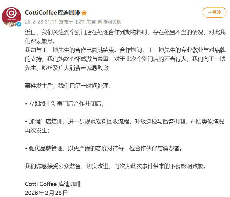 【直报网北京2月28日讯】(新闻坊)2月28日 针对有门店销毁 前代言人王一博合作物料 引发的争议 连锁咖啡品牌库迪咖啡 发布致歉声明称 ↓↓↓ 公司与王一博的合作已圆满结束 对于此次个别门店的不当行为 库迪咖啡向王一博、粉丝 及广大消费者诚恳致歉 近日,我们关注到个别门店在处理合作到期物料时,存在处置不当的情况,对此我们深表歉意。 我司与王一博先生的合作已圆满结束。合作期间,王一博先生的专业敬业与对品牌的支持,我们始终心怀感激与尊重。对于此次个别门店的不当行为,我们向王一博先生、粉丝及广大消费者诚恳致歉。 事件发生后,我们已第一时间处理: • 立即终止涉事门店合作并闭店; • 加强门店培训,进一步规范物料回收流程,升级巡检与监督机制,严防类似情况再次发生; • 强化品牌管理,以更严谨的态度对待每一位合作伙伴与消费者。 我们诚恳接受公众监督,切实改进,再次为此次事件带来的不良影响致歉。