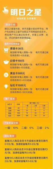 【直报网北京3月9日讯】(每日经济新闻)“抖音&快手点赞赚钱,点赞2元一条,点赞+关注5元一条,点赞+关注+评论10元一条。”刷刷短视频就能有收入,这样的赚钱方式让不少近期宅在家中的人颇为心动。 金女士便在其中一个。2月18号,她通过兼职群里的广告下载了一个这样的点赞赚钱APP。该APP宣称,其是抖音、快手流量分发合作平台,用户先在平台购买不同等级的会员卡,然后通过在快手、抖音上点赞、关注、评论获得收益。从2月18号开始,金女士陆续在该APP上购买了近4000元的会员卡,每天领取任务,赚收益。直到3月4号APP“跑路”,金女士账户内资金无法提现。 除了通过点赞获得收益,该APP用户还可以发展下线,获得推广奖励和收益分成,会员级别越高,推广奖励也越高,最高级别的钻石会员能获得的一级推广奖励是198元,二级50元,三级25元。 “这就是典型的传销。”一名律师向记者表示。而记者发现,上述“跑路”的APP并不是市场孤例,同种模式的平台还有不少。 服务器关闭+微信群解散 平台“跑路”前还有人加钱充值 “我是看到了兼职群广告之后下载了明日之星APP,从2月18号开始做,先买了38和188的套餐,做了大概9天之后回本了,后来就用两个号陆续又买了688和1888的套餐。”用户金女士向《每日经济新闻》记者表示。 要获得收益,得先投入本钱。明日之星的收益不是白给,用户需要先购买会员,才能领取任务。根据记者得到的明日之星宣传页面,其会员卡任务收益分为四档,青铜卡38元,每天可通过做任务获得2~4元的收益,白银卡188元,每天可获得6~15元收益,黄金卡688元,每天可获得20~40元收益,钻石卡1888元,每天可获得65~100元收益,四个会员卡全部购买一天可以获得收益134元。这些套餐的有效期都是一年。 在金女士投入之初,明日之星能够正常返佣提现,“我确实回本了才进行的下一次投资,我还让我朋友一起做。”金女士说道,“我发了朋友圈,愿意做的就咨询我,我告诉他们怎么做,大家都希望疫情期间做点兼职赚钱,我朋友充了两个会员,38和188。” “躺着赚钱”的日子太过短暂,金女士没有料到,平台“跑路”来得如此之快。 3月4号,金女士发现其所在的明日之星群被解散了。“APP会在凌晨的时候发布新一天的任务,我3月4号凌晨把任务做完了,准备白天提现,3月4号早上发现明日之星群都解散了。” 金女士看到,群主在群里 了所有人,称公司服务器遭受黑客攻击,目前不能正常注册和购买,公司技术人员紧急关闭服务器进行数据分析与恢复抢修。 “大家知道肯定是跑路了,如果真的是维护数据,没必要把所有的群都解散。”金女士告诉记者,其所在的两个微信群和一个QQ群,加起来大概有900人左右。 另一名用户任女士也是在微信好友的推荐下知道了明日之星,“我开了两个号,都买了全套会员,一共是5604元。我刚充值两天,APP就开始出幺蛾子,先是充值出问题,后来又降低提现金额,接着又要降收益,然后又恢复,恢复之后第二天早上就跑路了。” 一直到“跑路”前两天,明日之星都在用各种说辞拖延用户提现时间。金女士向记者提供的明日之星APP页面截图显示,3月1日,APP通知称,接银行通知,月初临时限制日提现笔数,为不影响所有会员正常提现,暂时调整提现50元起提,手续费不变,每提一笔扣1元,银行恢复限制后,提现将恢复20元起提。 紧接着,APP又通知称,关于任务佣金,根据广大会员的反馈,公司考虑到用户的利益,与传媒短视频公司合作方重新制定调整方案,下午恢复原价,同时接银行通知,预计本月中旬将恢复20元起提。 金女士告诉记者,3月2号和3号两天仍然有人在推广,在加钱充值。 推广奖励+收益分成 律师:是典型的传销 除了点赞赚钱,用户在明日之星上购买会员之后还可以发展下线,拿推广奖励。以青铜会员为例,一级推广奖励为4元,二级1元,三级0.5元。级别越高,推广奖励也就越高,钻石会员一级推广奖励198元,二级50元,三级25元。此外,推广人还可以获得下级会员做任务收益的分成,一级收益分成10%,二级收益分成5%,三级收益分成2%。 更“高阶”的还有团队提成,直推20人购买会员卡便可以升级为组长,成为组长之后,如果三级之后的下线购买会员,组长都将获得每张0.5元的推广奖励,三级之后的下线会员每做一个任务,组长还将得到0.2元的收益。 “这就是典型的传销。”中国政法大学知识产权中心特约研究员、北京志霖律师事务所律师赵占领向《每日经济新闻》记者表示,传销主要有两个构成要件: 其一是组织要件,即发展人员,组成网络,这也是俗称的“发展下线”,下线还可以再发展下线,以此组成上下线的人际网络,形成传销的“人员链”; 其二是计酬要件,以参加者本人直接和间接发展的下线人数为依据计算和给付报酬,或者以参加者本人直接和间接发展的下线的销售业绩为依据计算和给付报酬,形成传销的“金钱链”。 赵占领进一步表示,判断披着互联网外衣的新模式是否属于传销,可看其是否具备以下主要特征,是否需要交纳或变相交纳入门费;是否分层级,直接或间接发展下线;是否根据下线获利,上线从直接或间接发展的下线的人员数量或销售业绩中计提报酬或“返佣”。“如果认定传销,市场监管部门可以对公司进行行政处罚,公安机关可以按照组织领导传销罪进行刑事立案。” 记者采访了解到,明日之星用户通过支付宝支付购买会员,但收款公司却五花八门。