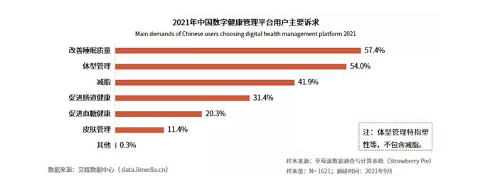 平台单一功能性成为痛点 iiMedia Research(艾媒咨询)数据显示,中国数字健康管理用户主要诉求有六大类,其中改善睡眠(57.4%)、体型管理(54.0%)、减脂(41.9%)较为突出。艾媒咨询分析师认为,数字健康管理平台用户需求明确,提高服务匹配度和体验感是中国数字健康管理平台的关注重点。