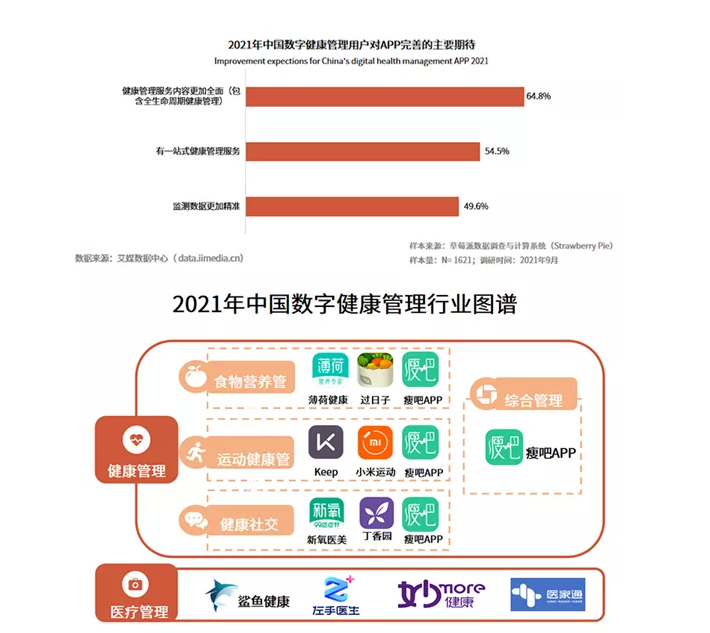 目前中国数字健康管理主要有三大功能布局,分别是食物营养管理、运动健康管理和健康社交,这三个功能构成了普遍用户的核心使用诉求。调研显示,64.8%的用户期待健康管理APP有内容更全面的服务(包含全生命周期健康管理),54.5%的用户希望APP能提供一站式的健康管理服务。瘦吧APP借助脂20科学减脂技术™,通过采集、评估、干预、跟踪四步构筑了科学健康减脂闭环,不仅每个月开设线上燃脂营,让用户接受国家体脂管理师和营养师的定期指导服务和实时监督,在社群中交流减脂心得、坚持打卡、分享营养食谱、互相鼓励,还提供专业体脂师免费减脂指导服务,成功打通食物营养管理、运动健康管理和健康社交三大功能,成为与同行差异化的,满足用户多元化需求的一站式综合型数字健康管理平台。截止至2021年12月,瘦吧APP全球总注册人数已突破230万,累计减脂超281万千克,在数字健康管理平台流量抢占竞争中有显著竞争优势。