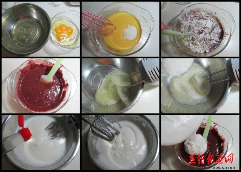 制作:1.将蛋白和蛋清分离, 蛋白放入无水无油的盆中; 2. 蛋黄和牛奶,油部分加入糖搅拌均匀; 3. 再加入过筛的低筋面粉和红曲粉;4. 将它们轻轻搅拌至光滑无颗粒;5. 将蛋白用电动搅拌器打发;6. 分两, 三次加入糖不停的搅拌; 7. 再加入几滴白醋继续打发一下;8. 直至打发蛋白成倒立的三角形; 9. 将打发好的蛋白的二分之一倒入蛋黄红曲糊中搅拌均匀; |