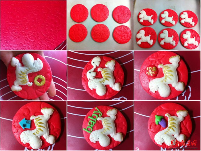 材料:饼干坯子6个,白色翻糖1斤,AM或者W家的色素若干 做法: 1.用白色翻糖加AM或者wilton色素几滴调出需要颜色的翻糖 2.红色翻糖用印花垫子印上喜欢的花纹 3.用圆形切模,切下合适尺寸的翻糖皮盖在饼干上 4.做6只小马,这个是用模具压的,没有可以捏一个 5.用白色做圆形,用刀切出里面的方形,并用AM的金色色素画上颜色 6.用白色翻糖捏球,用刀切出小象的鼻子,腿和尾巴,整形后贴上 7.直接在红色翻糖球上写金色的福字,做马上有福 8,用蓝色切出小房子,黑色勾边,画窗户和门 9.用小号字母切模做出BABY,捏茄子等~按你喜欢的造型来装饰吧▲ (原标题:幸福烘焙+马上有钱系列翻糖饼干) 责任编辑:王鹏娟 |