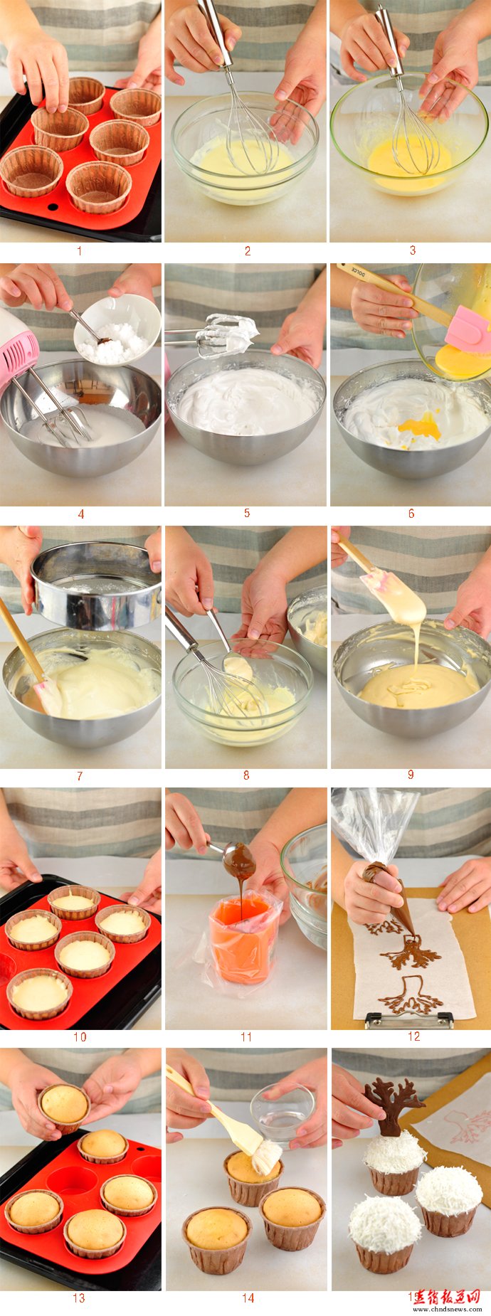 做法(对应上面步骤图的序号): 1.提前将烘焙纸杯垫在模具上。 2.黄油盛在耐热容器中,用微波炉加热20-25秒成液态,倒入淡奶油,搅匀后备用。 3.分离蛋黄和蛋白,在蛋黄中加入砂糖,搅拌2分钟至颜色变淡。 4.打发蛋白,当蛋白分别出现透明大泡、白色细腻小泡和有纹路的状态时分3次倒入砂糖。 5.打发到硬性发泡,提起打蛋器后蛋白表面出现短小直立的尖锋。 6.用刮刀从下往上地将蛋白与蛋黄糊翻拌均匀。 7.筛入面粉,继续用刮刀翻匀。 8.取1/6的面糊加入黄油和淡奶油的溶液里,用手动打蛋器迅速地朝着一个方向搅匀。 9.再倒入剩余的面糊里,用刮刀翻匀。 10.盛入烘焙纸杯8分满。放到预热到180℃的烤箱里,烤20-25分钟即可。 11.巧克力掰小块盛在耐热容器中,隔水融化成液态。将巧克力液装在裱花袋里。 12.在烘焙纸上用巧克力液画出树的样子,放在冰箱保鲜室里冷却凝固后取出。 13.蛋糕烤好后取出来,自然冷却。 14.在放凉的杯子蛋糕上薄薄地刷一层用砂糖和饮用水混合的糖水。 15.涂上打发好的淡奶油、撒上椰丝,插上巧克力树。用牙签在树梢上涂少许打发的奶油,点缀少许的椰丝和糖珠即可。 |