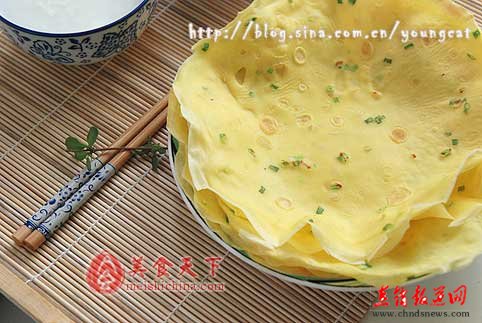 要点: 1、面糊要和成能流动的; 2、小火; 3、不能倒油,要用纸或猪皮将油均匀且小量地抹在锅内; 4、看到一面的边缘略稍起翘时,是翻面的时机。)原料: 普通面粉80克、牛奶120克、鸡蛋4个、香葱2根。 调料:盐。