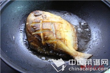 7 将平鱼放入锅内,小火慢煎,直到二面焦黄