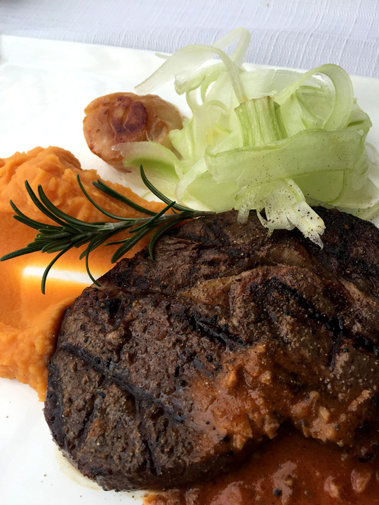 牛肉眼牛排,一共200g,一个人吃起来稍微有点负担,尤其还搭配了一大块南瓜酱,热量的负担啊,但是牛眼肉真是超美味,要的7成熟,没有血丝又不会老,椭圆形的牛眼里面有那么点小肥肉,超级香。