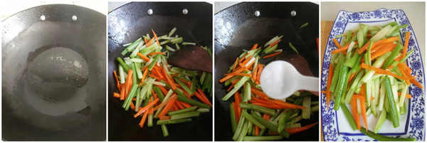 第三步:锅里加少许油,放入胡萝卜、佛手瓜、芹菜切成丝翻炒,加入少许盐调味,炒制7成熟,盛盘中放凉备用。