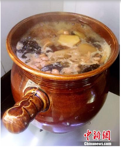 煲好的木瓜猪脚醋 李晓春 摄 【直报网北京5月14日讯】(中国新闻网) 题:广东台山人添丁喜欢用“煮鸡酒”和“煲酸醋”报喜 添丁增口,是喜添新丁、荣纳娇女的总称。凡是家里新添小成员,长辈们都很重视,并会张罗着以各种方式来向亲戚朋友们报喜。而在侨乡广东台山,人们喜欢用“煮鸡酒”和“煲酸醋”来传达喜讯。