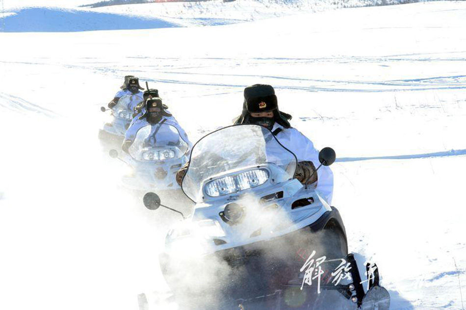 1月26日,内蒙古军区边防某团一连摩托雪橇巡逻队官兵在距离国界线2.5公里的地段执勤。
